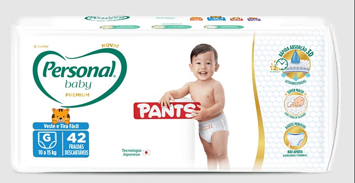 Muito mais fácil de vestir e tirar, a Nova Personal Baby Premium Pants é super macia como toque de algodão e tem um ajuste perfeito que não aperta na barriguinha nem nas perninhas.